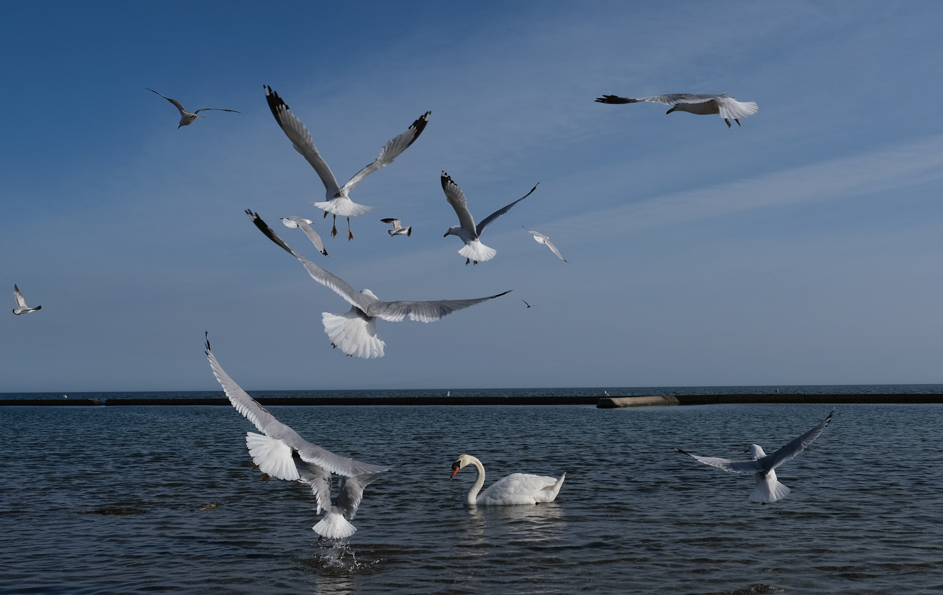 A swan surrounded by seagulls in the lake Ontario, perhaps looking for a significant other. The day was extra bright which gives the swan extra shine.